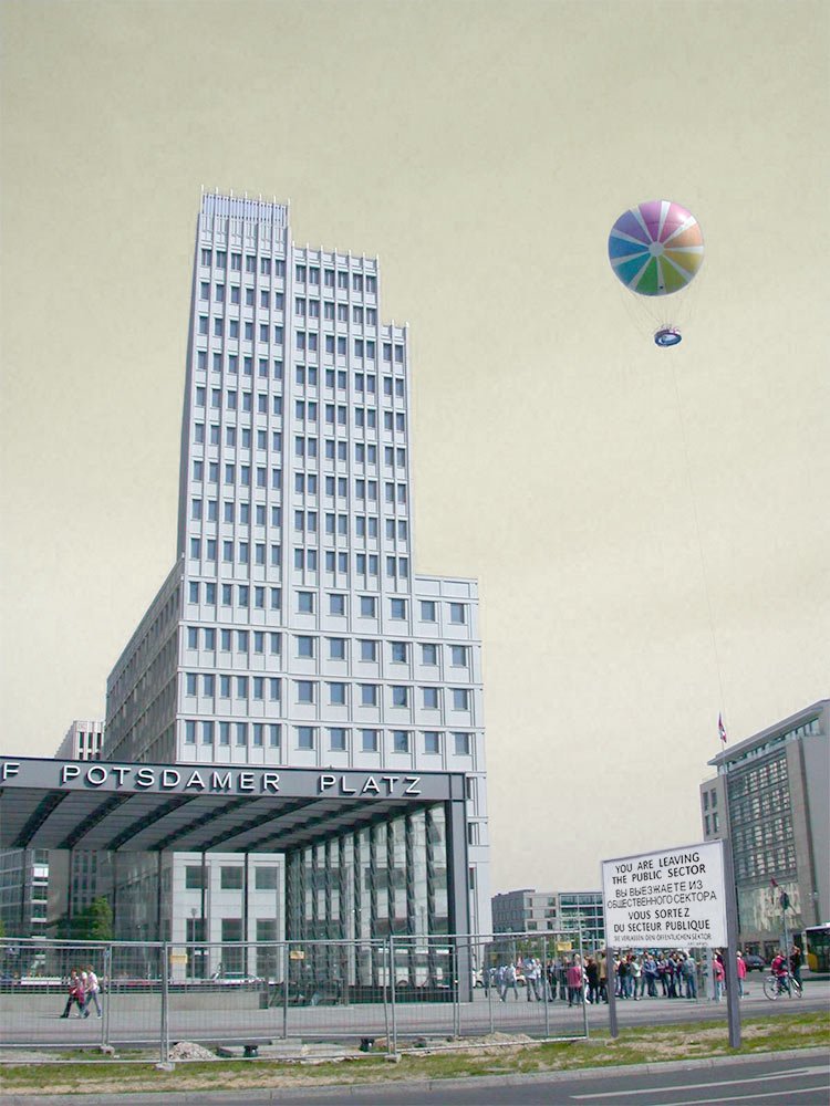 Entwurf für ein im Rahmen einer Guerilla-Aktion aufzustellendes Hinweisschild am Potsdamer Platz 2005 (digitale Bildmanipulation).