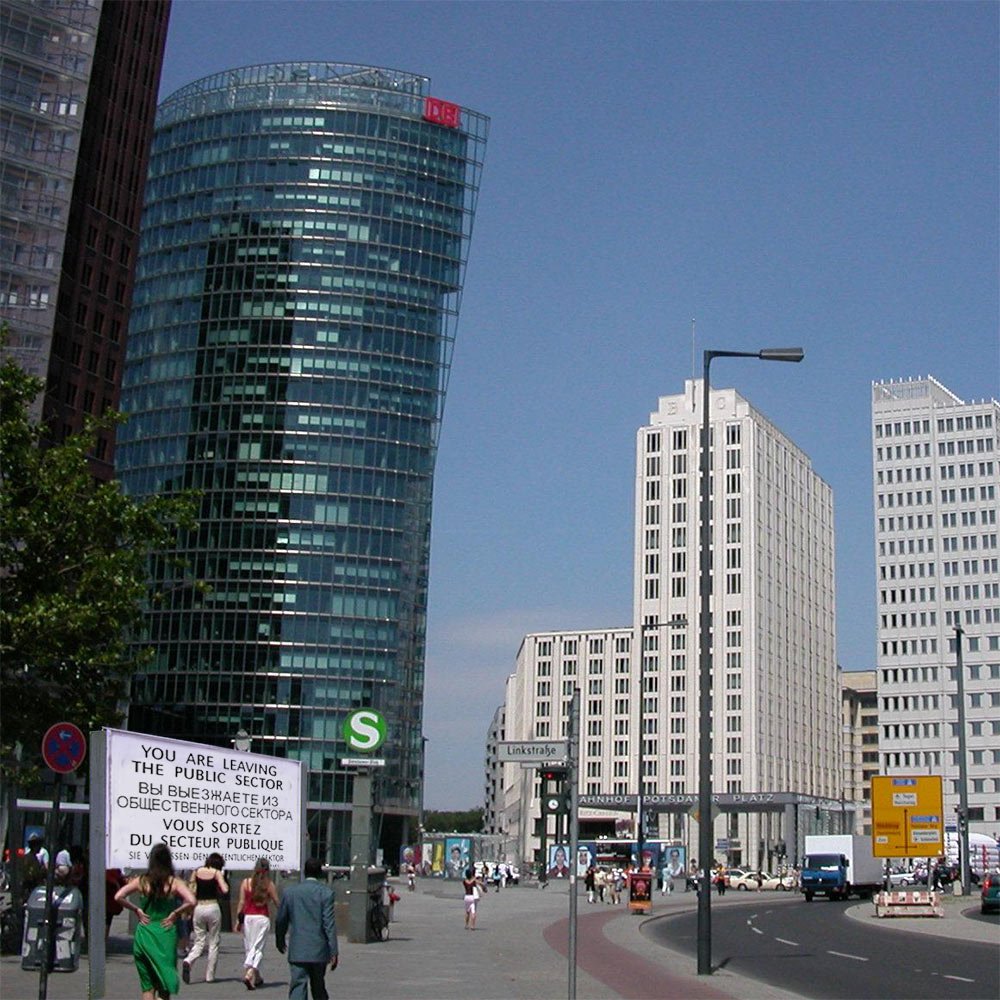 Entwurf für ein im Rahmen einer Guerilla-Aktion aufzustellendes Hinweisschild am Potsdamer Platz 2005 (digitale Bildmanipulation).